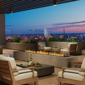 The entire viewing area is dedicated to the flame with the Flex Bench fireplace insert, creating a harmonious blend of the traditional fire pit and contemporary fire design.